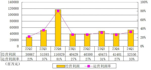 腾讯2024年第一季度按国际财务报告准则计算,经营盈利为526亿元(74亿美元),同比增长38%;经营利润率由上年同期的25%上升至33%。