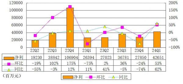 按国际财务报告准则下,腾讯2024年第一季度期内盈利为427亿元(60亿美元),同比增长62%;净利润率由上年同期的18%上升至27%;期内公司权益持有人应占盈利为419亿元(59亿美元),同比增长62%。