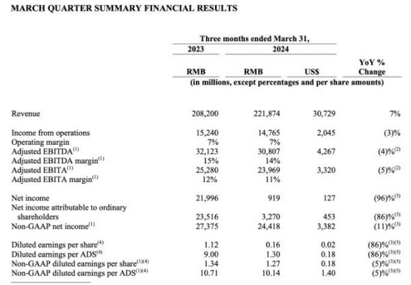 5月14日晚,阿里巴巴公布了2024财年,即2023年Q2至2024年Q1的年度业绩。这是一份不够亮眼的财报,在2024年Q1,阿里的收入为人民币2218.74亿元(307.29亿美元),同比增长7%,但净利润为人民币9.19亿元(1.27亿美元),同比下降96%,或人民币210.77亿元。