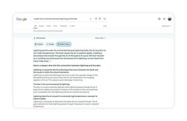 AI Overview,顾名思义,是指用户键入文本、点击搜索之后,出现在最上方的将是AI帮忙整理的信息摘要。其中包含用自然语言对搜索结果的总结和概括,以及推荐的链接。从前这被谷歌称为“搜索生成式体验(SGE)”。