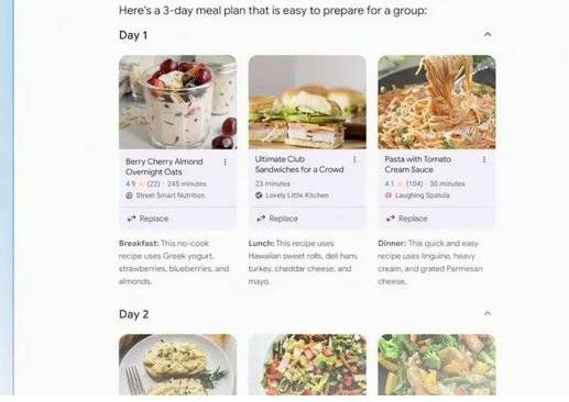 多步推理Multi-step reasoning则可以用来做计划。当用户在搜索框键入“附近最好的瑜伽馆”时,AI摘要会将附近瑜伽馆依照评分、课程、距离等信息分类成块,更清晰地展示给用户。Planning in Search则允许用户直接用谷歌搜索做计划,如在搜索框中键入饮食计划的需求,搜索引擎会给你自动生成一份。