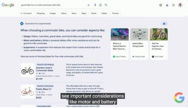想要搜索商品的时候,AI同样会发挥作用,在搜索框键入“有上下坡的五英里通勤自行车”,搜索引擎会在上方给出选购自行车的思路建议,并给出若干商品推荐。