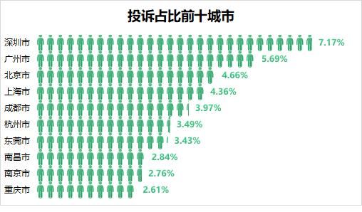 在网约车行业消费者投诉地域分布上,深圳的投诉量占比最高,达到7.17%,紧随其后的是广州、北京和上海,分别占比5.69%、4.66%和4.36%。由此可见,一线城市的网约车服务问题尤为突出。