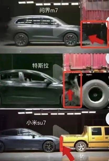 不过个人觉得,这种新测试的一致性有很大欠缺,甚至没有什么可比性。因为这几次碰撞测试中,不仅没有统一半挂车的型号及配重,三款测试车:问界M7、特斯拉和小米SU7的几次碰撞挂车方式,也很不一样。