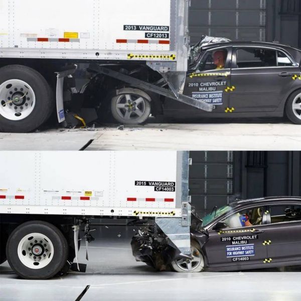 25%偏置碰撞起源于北美的IIHS,其原因是死亡率较高的事故中,这种更小的重叠面积碰撞是致命的主要原因。对比小车撞挂车,25%小偏置碰撞的伤害竟然都没那么严重了,可见小车撞挂有多凶险。