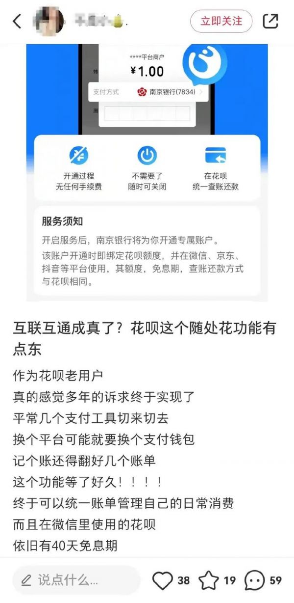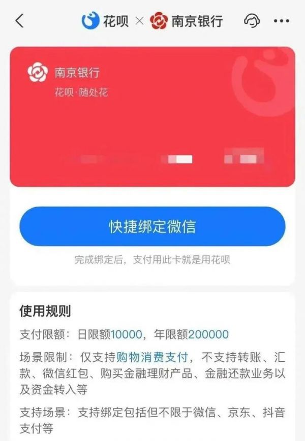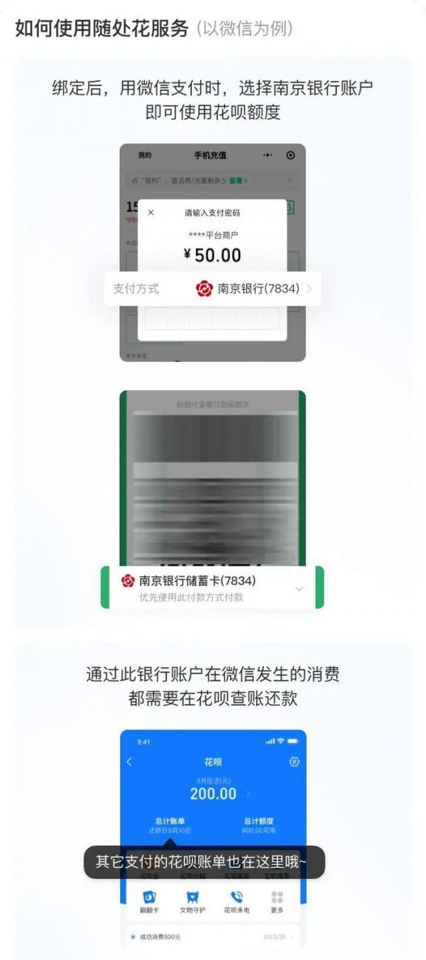 近日,支付宝与南京银行达成合作,推出了一项名为“随处花”的新功能。该功能允许用户在微信、京东、抖音等平台通过绑定的银行卡使用花呗额度。