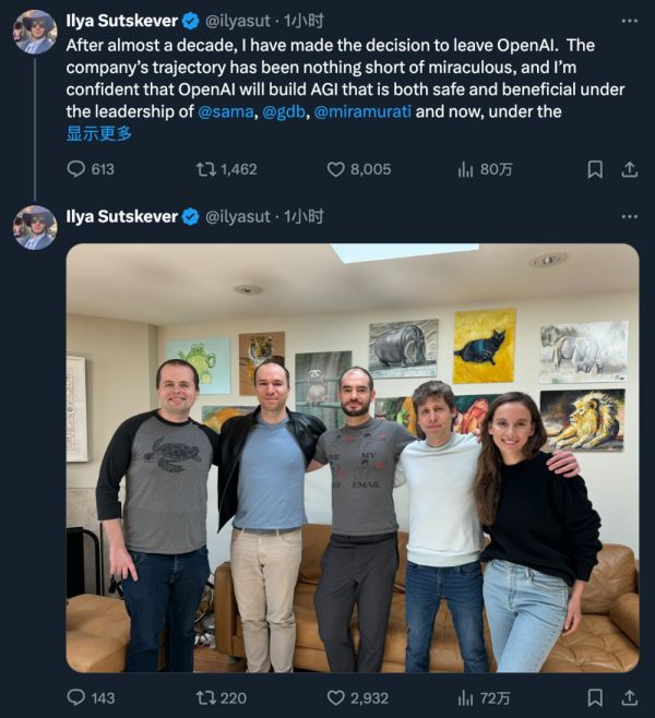今天,OpenAI 联合创始人、首席科学家 Ilya Sutskever 发推宣告离职。