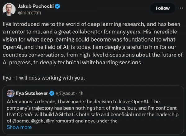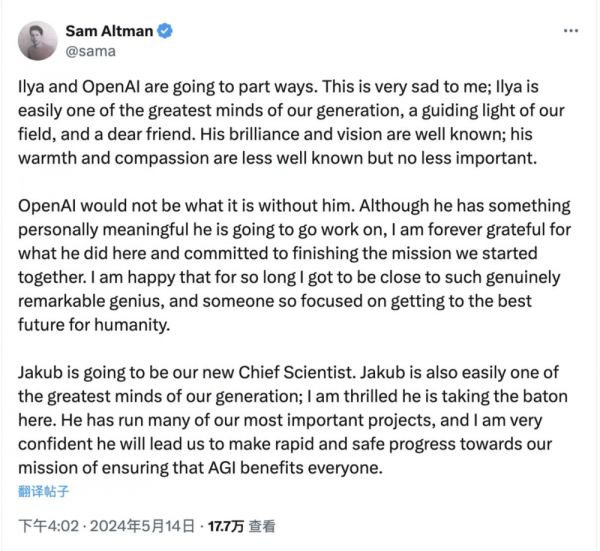 Jakub Pachocki 将成为我们的新首席科学家。Jakub 同样无疑是我们这一代最伟大的思想家之一;我很高兴他将在这里接过接力棒。他负责过我们许多最重要的项目,我非常相信他将带领我们快速而安全地朝着确保通用人工智能(AGI)惠及所有人的使命前进。