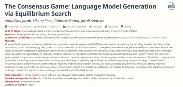▷Jacob, Athul Paul, et al. "The consensus game: Language model generation via equilibrium search." arXiv preprint arXiv:2310.09139 (2023).