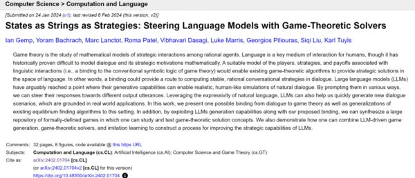 ▷Gemp, Ian, et al. "States as Strings as Strategies: Steering Language Models with Game-Theoretic Solvers." arXiv preprint arXiv:2402.01704 (2024).