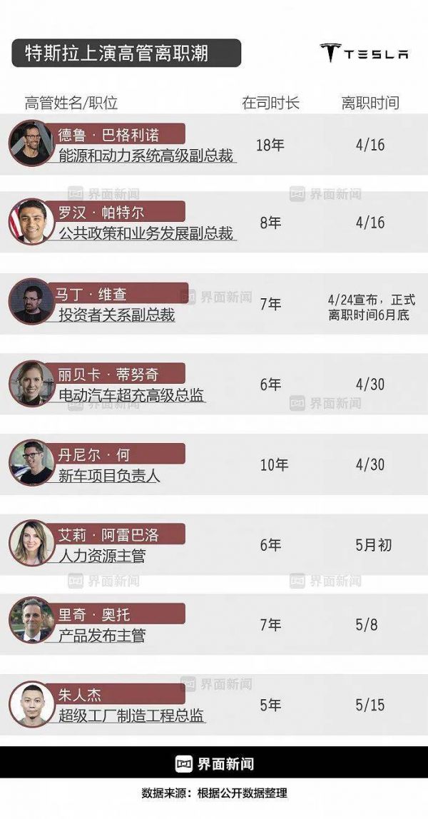 据界面新闻不完全统计,自4月15日特斯拉CEO埃隆·马斯克宣布全球裁员以来,一个月的时间里已经有10位高管先后宣布离职。
