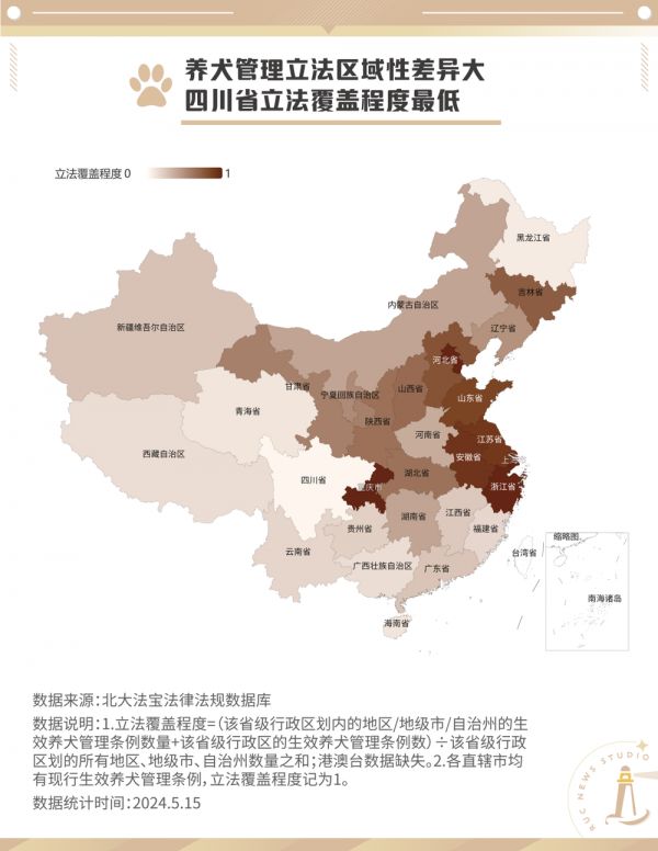 根据《2022年中国宠物消费报告》,2022年城镇居民所养犬只数量已达到5119万只;而查询北大法宝法律法规数据库可知,截至2023年底,我国没有通行的养犬管理法律,但全国各地已颁布了528部养犬相关的地方法规。