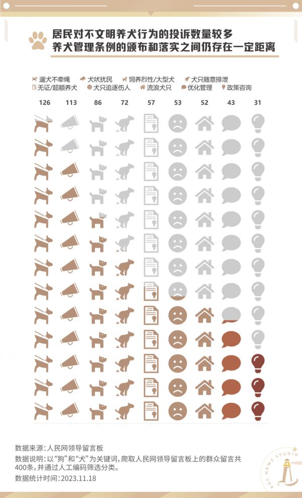 在人民网领导留言板以“狗”和“犬”为关键词进行检索,不拴狗绳、不办狗证、噪音扰民等各地养犬管理条例中的常见条款仍是投诉信息里最热门的关键词,无人管理、无处投诉依旧是居民求助最主要的原因。