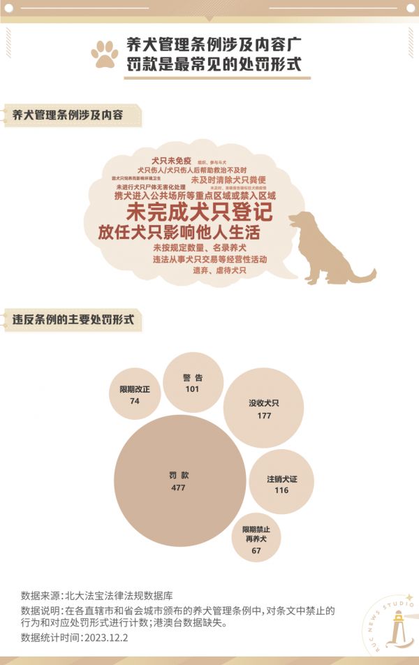 对于一般的违规行为,基本每个城市都有着一套复杂而详细的处罚规则,处罚措施包括由警告、罚款到没收犬只等组成的一系列手段,以小金额的罚款手段居多;执法责任分配则因地而异,大多由公安机关或城市管理机关主管,具体的执法任务则因规定内容不同而细分到不同单位,包括农业农村部门、市场监督部门等。