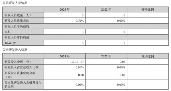 但公司似乎毫无研发基因,2022年研发人员、研发投入均为0,2023年新招了3名本科学历的研发人员,研发投入金额3.73万元,占营收比例0.01%,后续仍需加大投入。