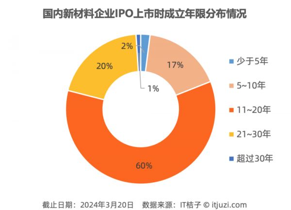 IT 桔子数据显示,国内新材料企业 IPO 上市时,有 60% 的企业成立 11~20 年,20% 的企业成立 21~30 年。