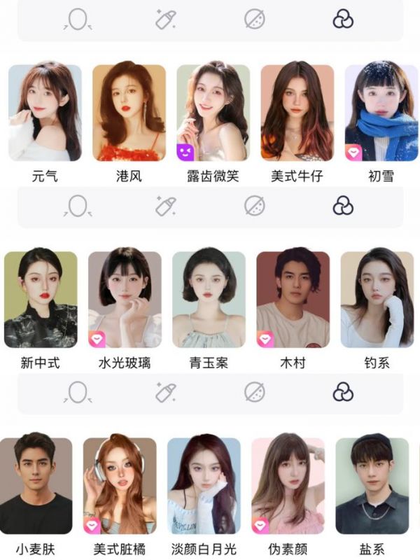 (美图秀秀上的各类美颜滤镜)尽管风格各不相同,但各式各样的美颜滤镜却几乎都导向了相同的审美观:消除缺陷,靠近某种程式上的“美”。
