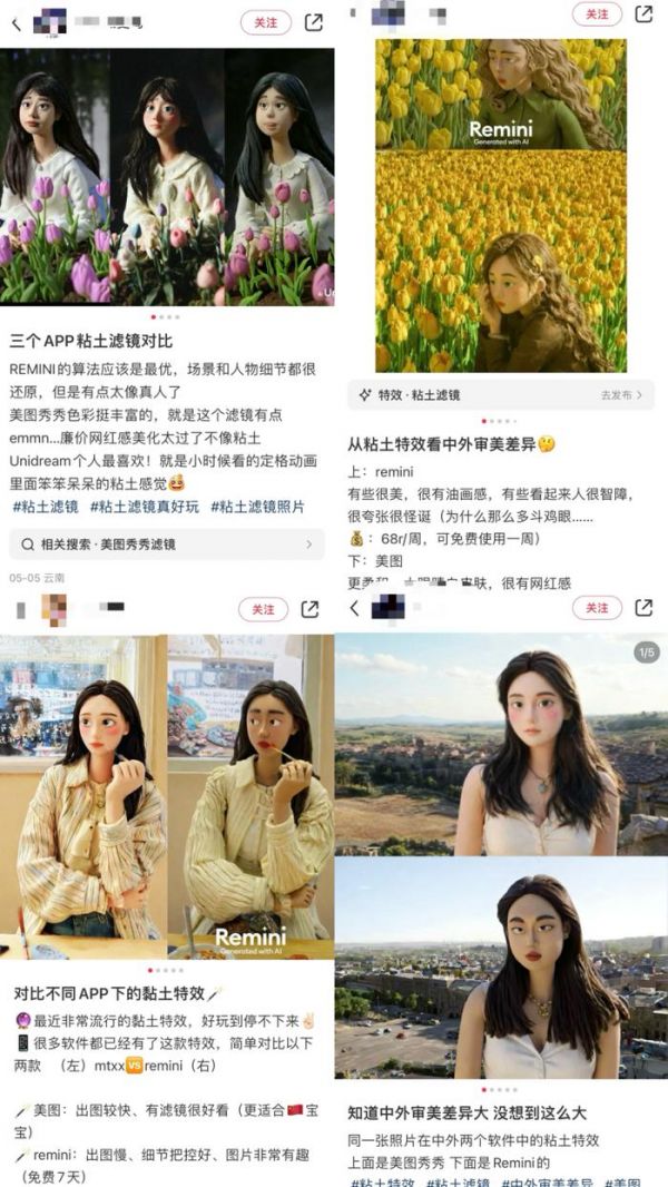也有不少人将目前主流的几款黏土滤镜进行对比,认为美图秀秀人像过于美颜精致,反而失去了黏土风的精髓。