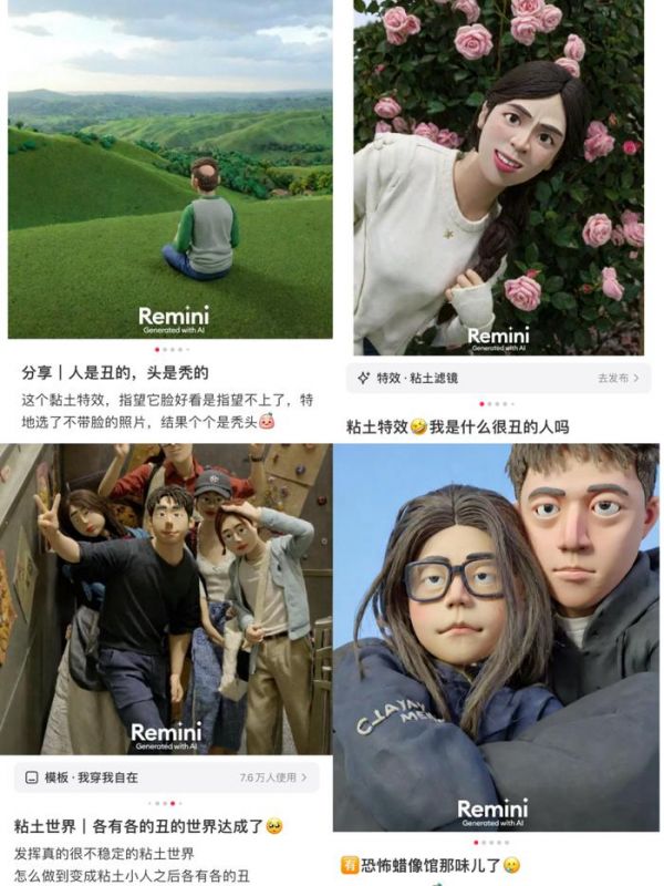 这些图片都由“AI黏土滤镜”生成,该滤镜首发于一款名为Remini的AI修图软件,近期因其丑萌的独特画风而出圈。