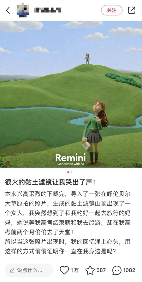 (小红书上关于AI黏土滤镜的帖子)AI计算的一个错误却阴差阳错的弥补了一个遗憾。在虚拟与真实的时空缝隙,实现了她与母亲一起去旅行的心愿。