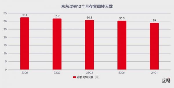从存货周转天数看,在2023第一季度,京东相关数据为32.4天,而2024年一季度这一数据下降至29天。