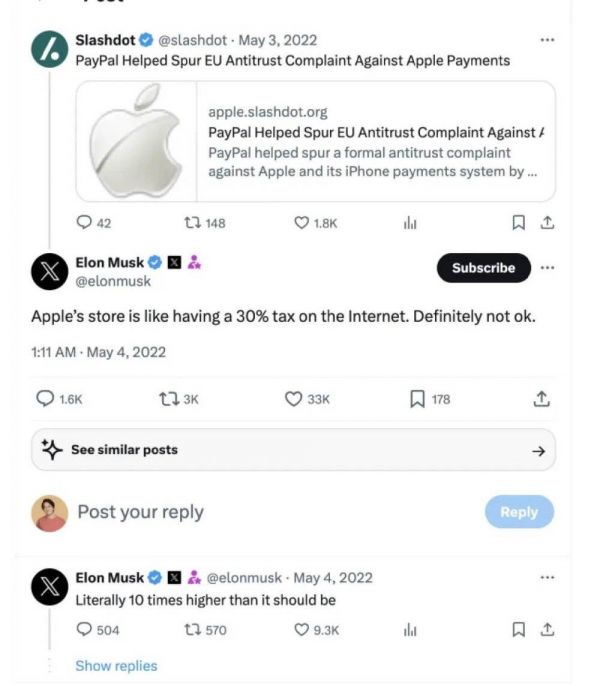 Epic Games的做法得到了特斯拉公司CEO、X(推特)CEO 马斯克的隔空支持,他曾不止一次在X上批评30%的苹果税税率过高,甚至威胁说“如果苹果下架了X,那么他就选择做一款内嵌这个程序的手机。”要知道,美国联邦企业所得税的税率也只有21%,比苹果税税率低了9个百分点。