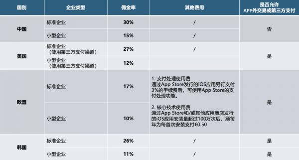 但在美国本土、欧盟以及日韩和印度等主要市场,苹果税的税率却更低,且与苹果在这些市场的政策稍有松动不同的是——在中国,苹果公司仍然完全禁止用户从第三方应用商店或网站下载应用程序和在应用程序以外交易或使用第三方支付。