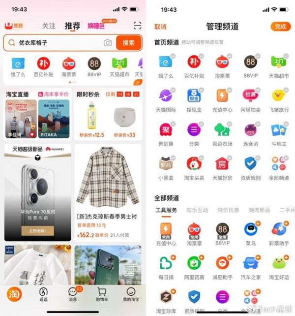 除了简化大促规则,淘天也一直在给手淘APP做减法。淘天把APP的首页信息变得更加简洁,主动减少了首页频道这一固定模块的占比,用户可以根据喜好精准匹配不同的频道组合,并且而增加了信息流占比。