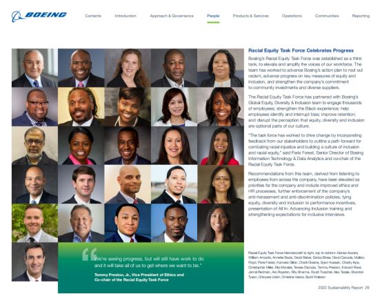 翻开波音2022年发布的ESG报告,我们的确能够发现所谓的“多元、平等、包容”在其中占据了较为主要的篇幅,其对于2030年的目标是“在公司中增加女性和少数族裔的骨干人数”。