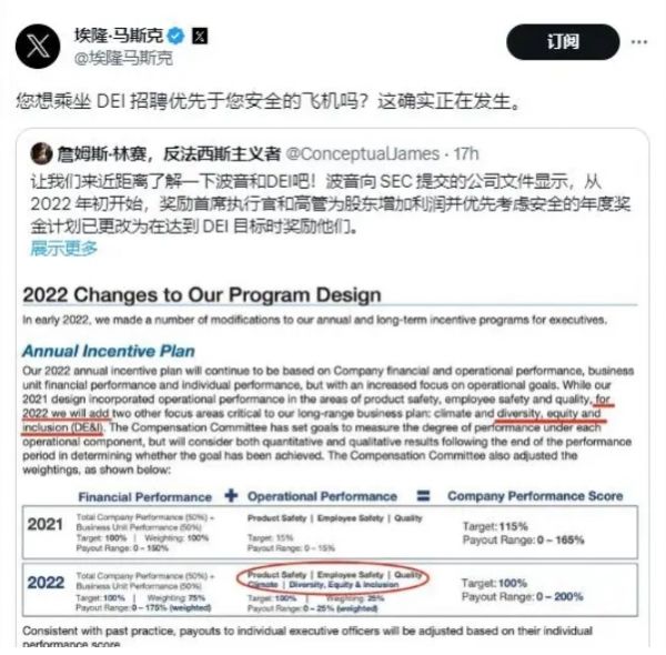在今年一月那起波音“门塞脱落”事件发生后,马斯克连在X上发布两条推文,第一条是:“您想乘坐 ‘DEI 招聘’优先于您安全的飞机吗?这件事确实正在发生。”第二条是“人们会因DEI而死亡”。而推文附带的链接,都与这次波音事件相关。
