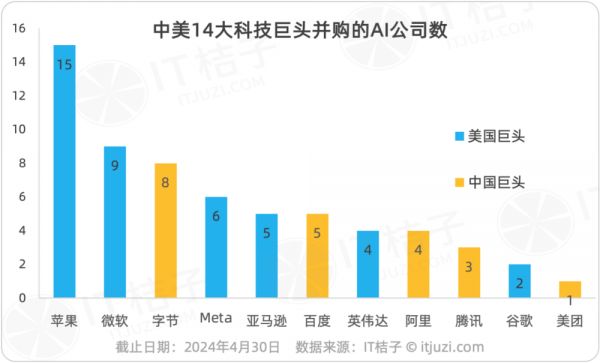 IT 桔子数据显示,苹果 Apple 并购的人工智能公司是最多的,达到了 15 家,远远超越了微软 Microsoft、Meta 等,可谓“AI 并购之王”。