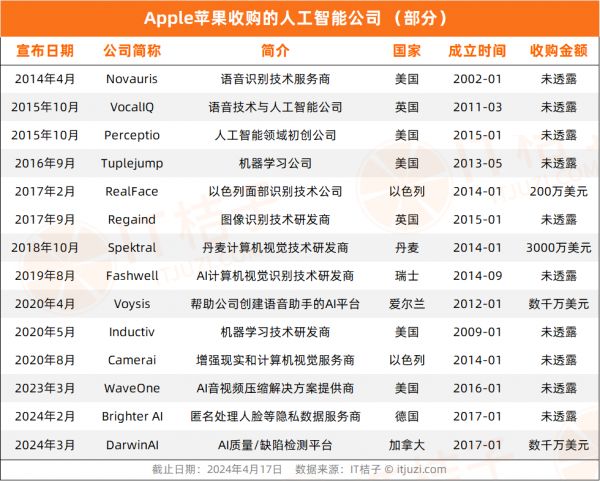 根据 IT 桔子数据,最早在 2014 年,苹果宣布收购了一家总部位于英国的语音识别技术公司 Novauris。Novauris 团队自 2013 年秋天以来一直在苹果公司工作,致力于改进基于 Sirispeech 的虚拟助手服务 Siri 技术。