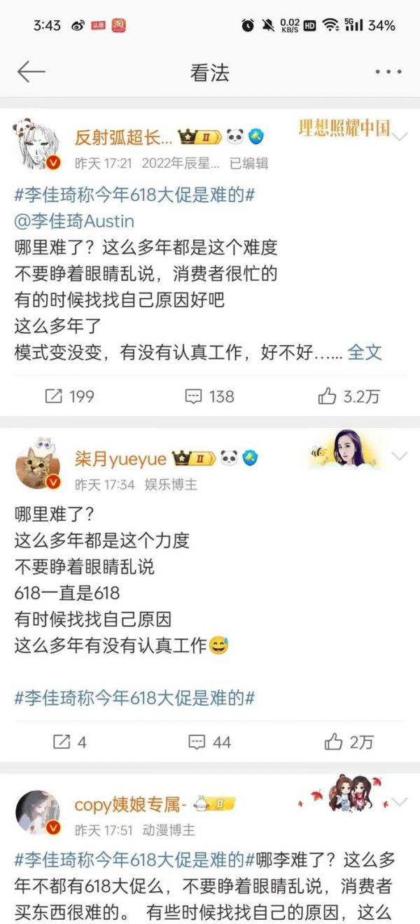 2023年的李佳琦曾陷入舆论漩涡。9月份的一次日常带货直播中,因为有网友吐槽79元一支的花西子眉笔太贵,随即被李佳琦反驳,“不要乱说,眉笔一直79,国货品牌很难的,有时候找找自己原因,这么多年了工资涨没涨,有没有认真工作?”