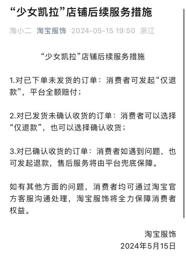 网红店铺“少女凯拉”突然关店,相关订单能否继续发货、已发货订单后续服务能否保障?淘宝服饰第一时间发布后续服务措施,表示兜底赔付和服务,全力保障消费者利益。