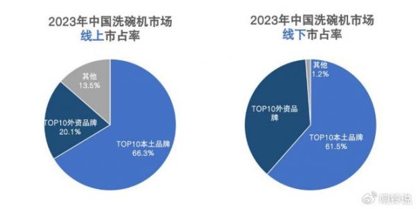 在美的、方太这些品牌的推动下,现阶段国产品牌已经在洗碗机赛道实现了反超。此前,国家工业信息安全发展研究中心、工信部电子知识产权中心发布了《中国洗碗机专利创新研究报告(2024)》,数据显示,2023年中国洗碗机市场上,排名前十的本土品牌共占据66.3%的线上渠道市场份额和61.5%的线下渠道市场份额,远超排名前十的外资品牌市场份额总和,强势扭转曾经由海外品牌主导的市场格局。