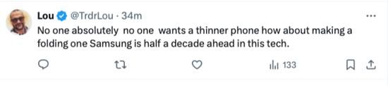 还有网友说,没人想要更薄的iPhone,折叠屏多香,三星在折叠屏技术上已经领先苹果五年了。
