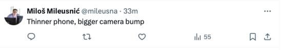 分析认为,更薄的新iPhone可能会重新激发消费者对该产品的兴趣,给消费者提供升级设备的理由。自2020年iPhone 12发布以来,苹果因每年只对iPhone的设计进行微小改动而受到批评。例如,2022年,苹果已故联合创始人史蒂夫·乔布斯的女儿伊芙·乔布斯在Instagram上调侃iPhone 14的设计与iPhone 13几乎相同,引起了媒体的关注。