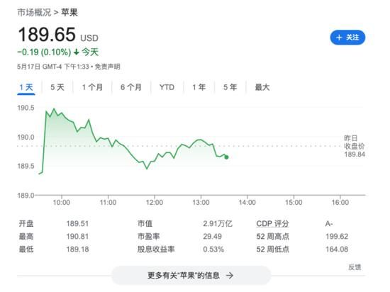苹果股价周五美股盘中下跌0.1%,报189.65美元。