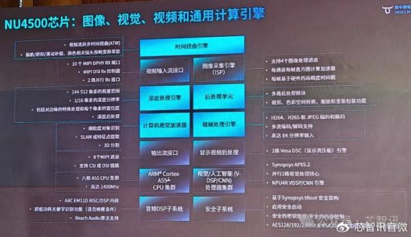 NU4500还拥有基于硬件的图像深度视觉引擎,包括领先的自研的深度引擎、计算机视觉加速引擎、图像后处理模块、异步时间扭曲(ATW)引擎等,能够与其高性能CPU、VPU、AI和ISP内核紧密结合,可以支持单芯片10个输入视频流,具备强大的3D空间计算功能,能够以低功耗提供3D感知、AI和各种空间计算应用支持。