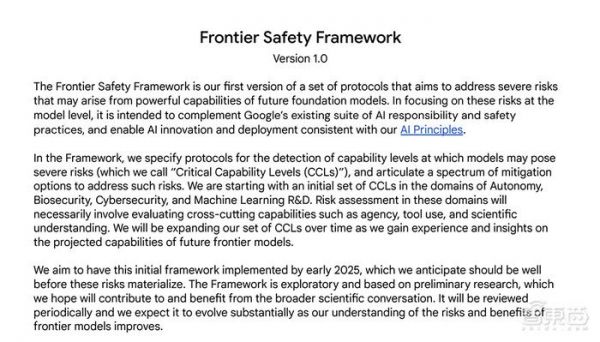其计划是到2025年初全面实施这一初步框架。该框架侧重于模型级别的强大能力(如特殊机构或复杂的网络能力)所导致的严重风险,对谷歌的一致性研究进行补充。