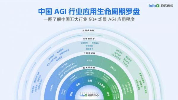 InfoQ 研究中心在研究过程中发觉,目前各行业数字基础不同,应用场景需求紧迫性不同,因此 AGI 在各行业应用程度也不同。因此根据探索时间、应用成果、用户反馈等内容,并结合专家访谈,InfoQ 研究中心将 AGI 在各行业的应用生命周期划分为四个阶段:应用探索期、产品测试期、市场投放期和应用成熟期。