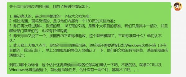 (5)有所有项目成员以及甲方的群:现场也是需要同步信息的,比如我们制定一个计划,或者确认的需求,反正就是各种结论性的东西,都往群里丢一下,省得后期不认账。