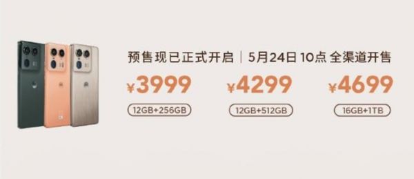 moto X50 Ultra 的 12GB+256GB 版本售价为 3999 元;12GB+512GB 版本为 4299 元;16GB+1TB 版本为 4699 元,并将于 5 月 24 日 10 点全渠道开售,感兴趣的朋友可以关注一下。
