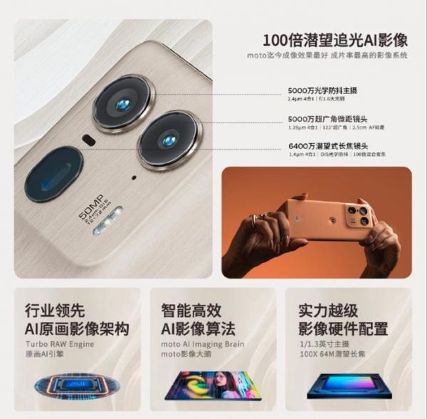 moto X50 Ultra 的影像部分比较强悍,内置了 5000 万像素的主摄,1/1.3 英寸的传感器尺寸,f/1.6 大光圈,还有一枚 5000 万像素的超广角镜头,支持 122 度超广角,还有 2.5cm 的超级微距拍摄,还有一枚 6400 万像素的潜望式长焦镜头,支持最高 100 倍混合变焦,主摄和长焦镜头都有 OIS 光学防抖。