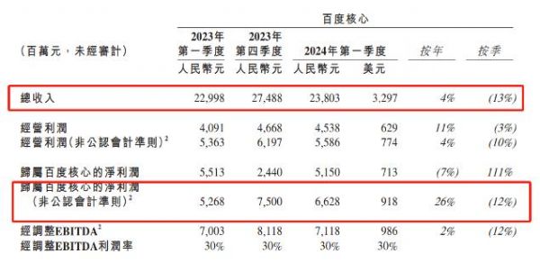 “2024年第一季度,百度核心营业利润率(Non-GAAP)达23.5%,同比、环比均实现增长。我们已经建立了持续提高运营效率的记录,在未来几个季度,我们将执行所需措施来提升运营效率,以支持我们的人工智能业务和高质量增长,并保持健康的营业利润率(Non-GAAP)。”这是百度首席财务官罗戎谈及本季度财报时发表的观点,在强调百度核心营业利润的同时,罗戎弱化了对于集团营收整体增长的评价。