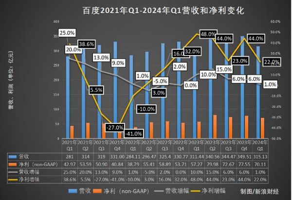 百度昨晚发布了新一季度财报。根据2024年Q1财报,其季度营收315亿元,同比增长1%;归属公司净利润(Non-GAAP)70.11亿元,同比增长22%,超出市场预期。