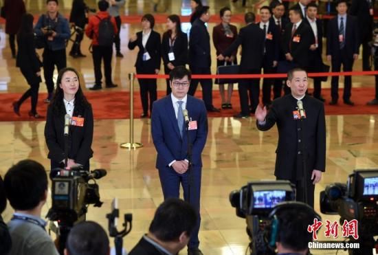 3月8日,十三届全国人大二次会议在北京人民大会堂举行第二次全体会议。图为全国人大代表梁倩娟、姚劲波、罗鹏(从左至右)在“代表通道”接受采访。中新社记者 侯宇 摄