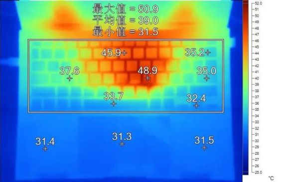 表面温度如上图所示,键盘键帽最高48.9℃出现在“K”键上,WASD键为37.6℃,方向键32.4℃。左腕托温度为31.4℃,背面中心点37.1℃。