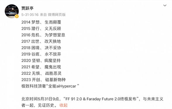 先是5月7日发布微博宣布重新出任FF联席CEO,表态意味着要承担救FF的责任,并且开启个人IP商业化用于赚钱还债和造车,并称收到了大量的合作需求,协议逐步展开洽谈。