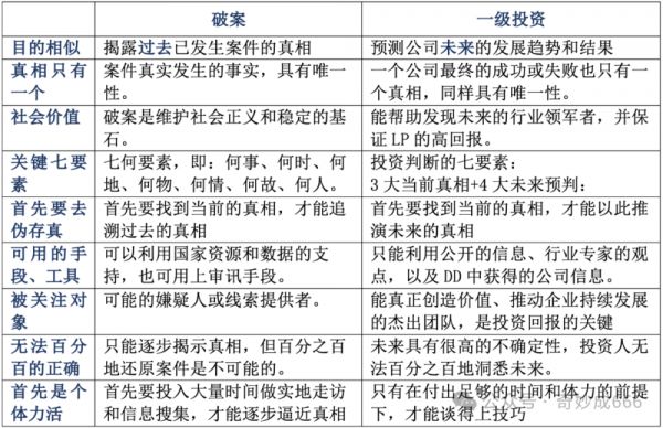 对被关注对象的态度。破案过程中,我们面对的可能是嫌疑人或线索提供者;而在一级投资中,我们打交道的是那些能够真正创造价值、推动企业持续发展的杰出团队。他们是我们获取投资回报的核心合作伙伴,因此,我们应当给予他们最大的尊重和感激。